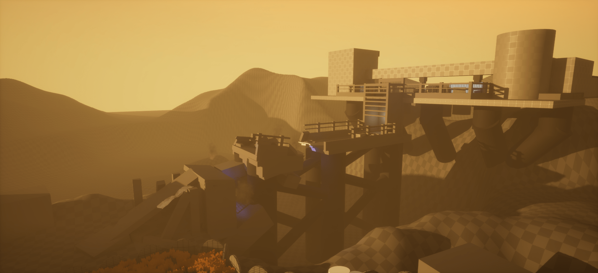 My goal for this blockout is to create an engaging and dynamic environment inspired by Call of Duty, set within a cyberpunk amusement park. This level challenges the player with: