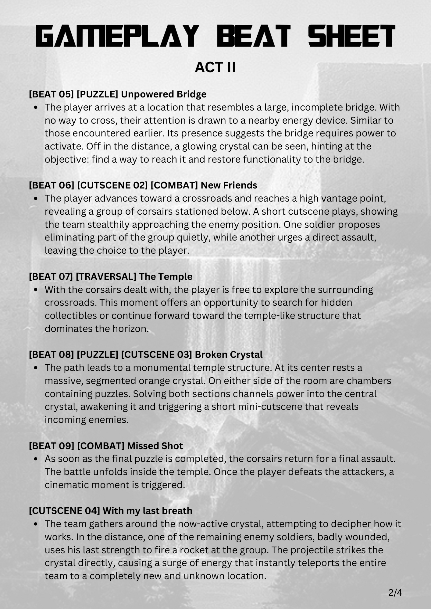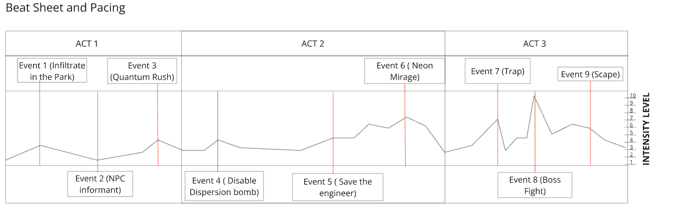 - Broke down the story into a quest chain, split it into gameplay beats, and assigned intensity values.