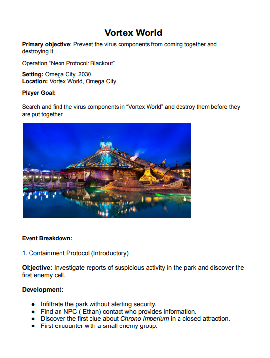 The player must locate and deactivate both parts of the virus before they are released inside Vortex World. If they fail, the entire park —and everyone inside— could be lost forever.