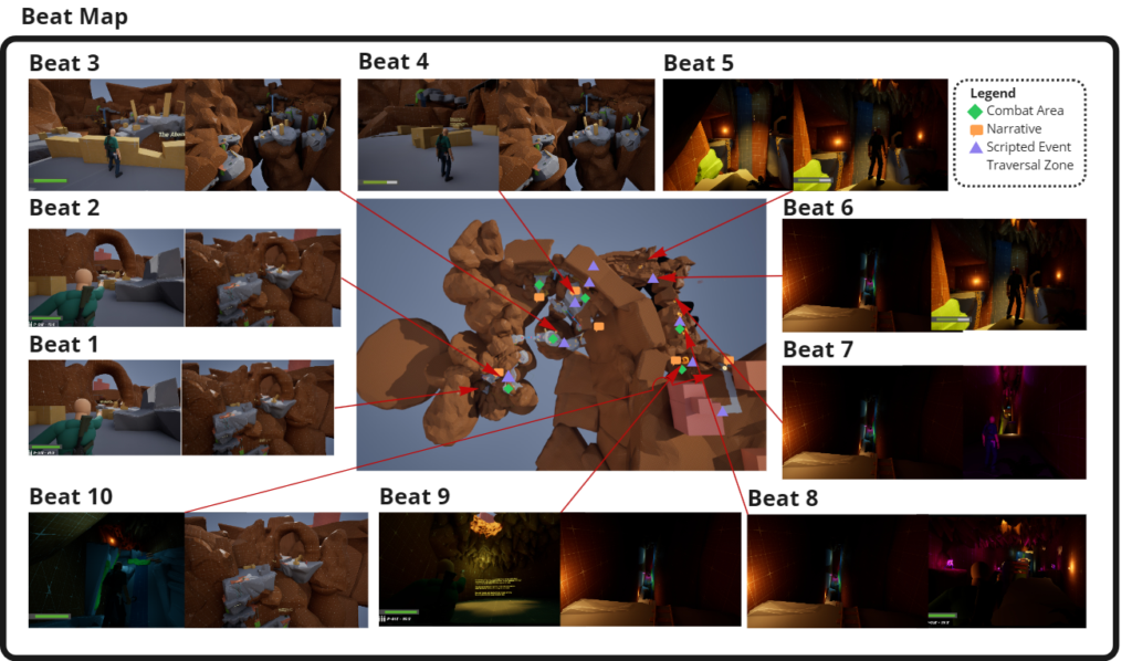 - Built a gameplay intensity graph to visualize pacing across the level, aligning each beat with corresponding map areas to communicate flow and player tension effectively.