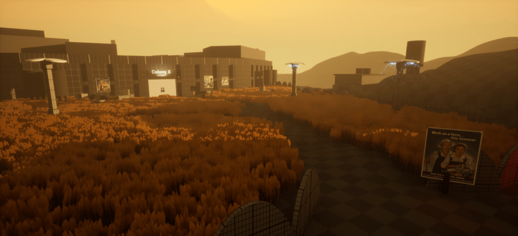 Peaceful wheat fields lull the player into a false sense of calm – until they stumble upon a corpse. An old guard speaks of a virus and sends the detective to find a backup battery to open the colony gates.