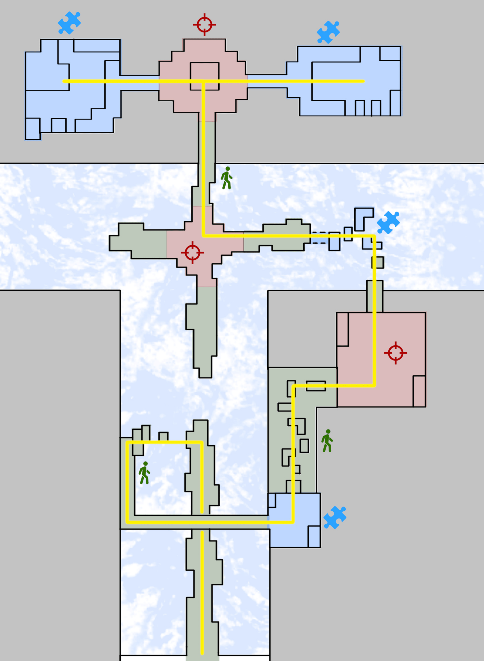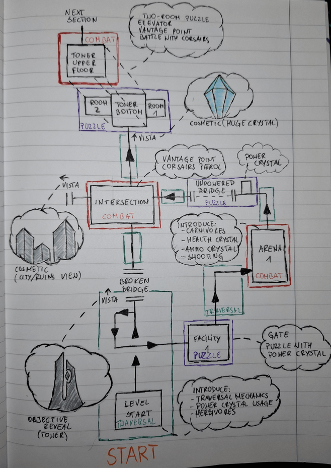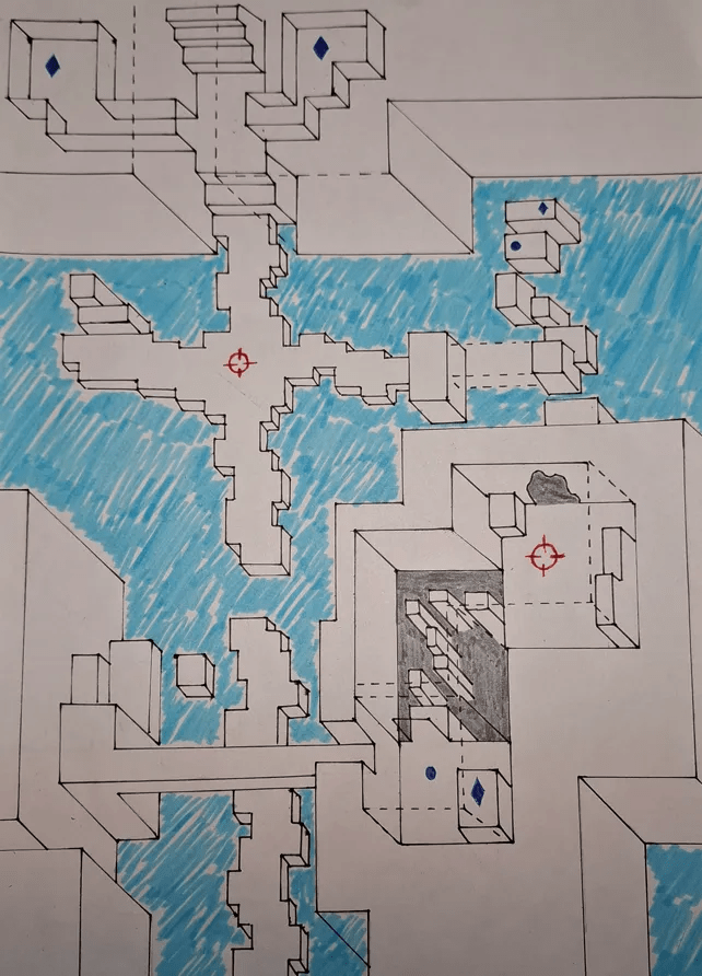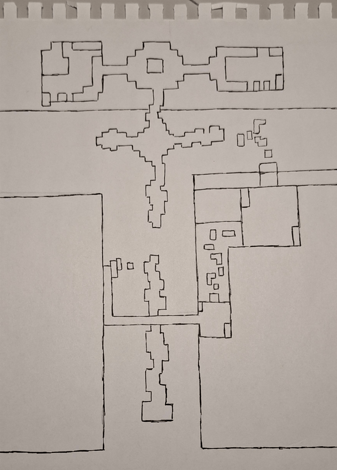I first created a high-level map sketch on paper to outline the key traversal, combat, and puzzle zones. Then, I drew a more detailed version of the map, further developing the layout. Finally, I refined it using GIMP to polish the design before transitioning to 3D.